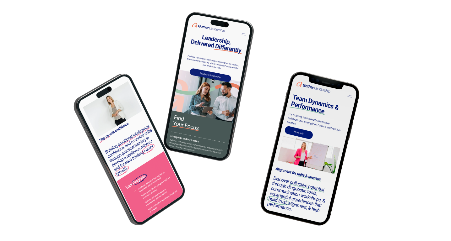 We partnered with Gather Leadership to move their brand away from an ocean of ordinary to a human centred identity that genuinely reflects their work and ethos. The rebrand and website needed to feel warm, exploratory, and quietly confident - inviting clients into the conversation, in a challenging yet unpretentious way. It was important the brand held its own in a corporate, evidence based space.